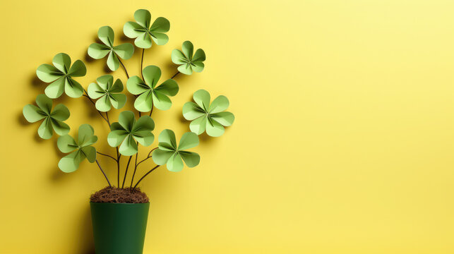 green paper clover on a yellow background, shamrock, symbol, st. patrick's day, luck, nature, plant, national irish holiday, spring, march 17, flower, tradition, religious