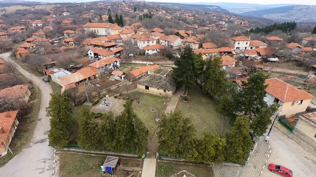 Low-altitude March drone footage of Kakrina Inn near Lovech, showing the historic building, courtyard and village in a smooth sideways move, BG, EU, 02 March 2019