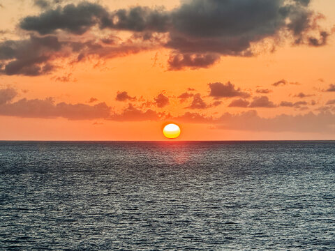 Basseterre, Saint Kitts - March 28, 2024: The sunset off the shore of Saint Kitts from the water