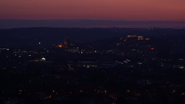 Brno, Czech Republic - March 29, 2025: View of the city from above at night. Evening city panorama. Špilberk Castle