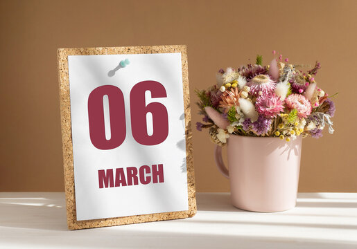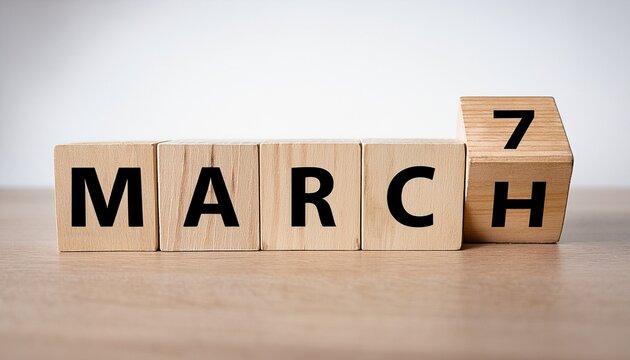 Minimalist photo of a wooden blocks with date 7 March. Day and month, calendar on white background