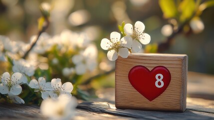 Spring blossom, wooden heart, number eight, outdoor, calendar