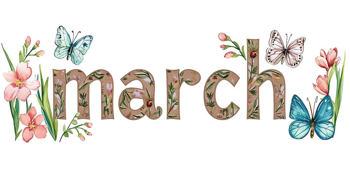 March Hand Lettering with spring flowers Hand Drawn Decoration