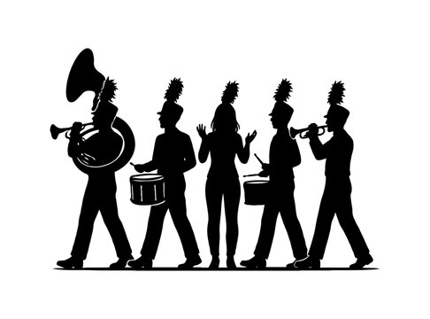 silhouette of a marching band with tuba, drums, and trumpets on a transparent background, featuring five figures