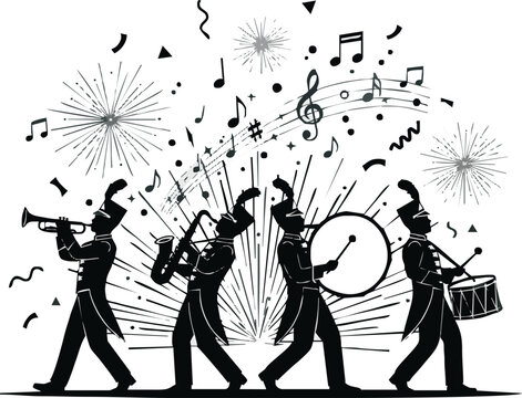 Silhouette of a marching band performing with musical notes and fireworks, creating a festive celebratory atmosphere.