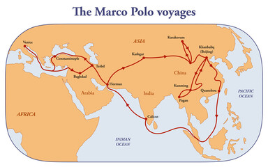 Map of the Marco Polo voyages through Asia along the Silk Road