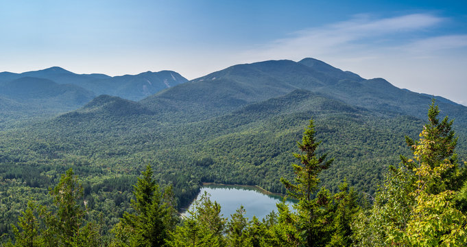 Panorama of the Adirondack high peaks and Heart Lake from Mount Jo.