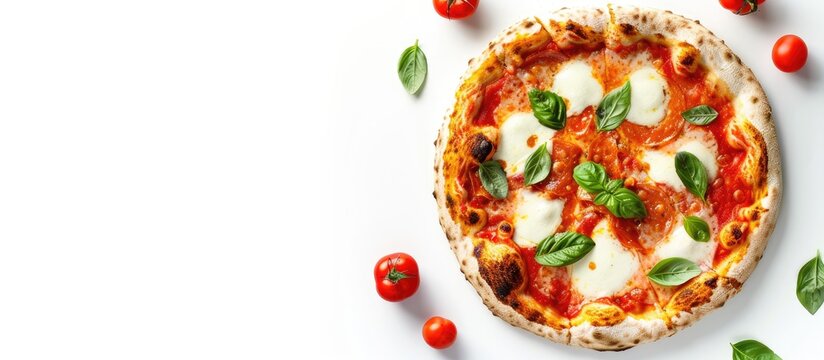 Pizza Margherita on wooden background, top view. Pizza Margarita with Tomatoes, Basil and Mozzarella Cheese close up.