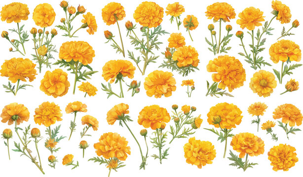 Marigold flowers blossoms, leaves and buds. Red and orange tagetes or cempasuchil blooming flowers, Mexican Dia de los Muertos, Day of Dead holiday and Indian Diwali festival vector floral decorations