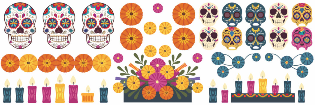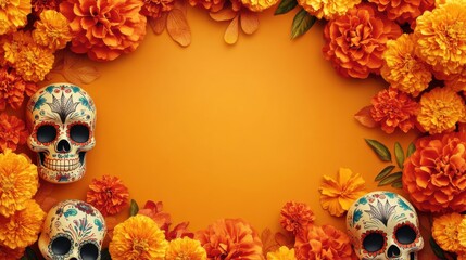 Decorative sugar skulls and marigolds for Day of the Dead – Ideal for Día de Muertos content, party invitations, or cultural branding
