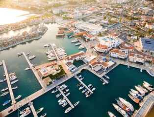 Drone view of a marina with boats and yachts