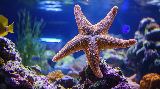 A close-up of a starfish resting on coral in an aquarium surrounded by various fish and corals