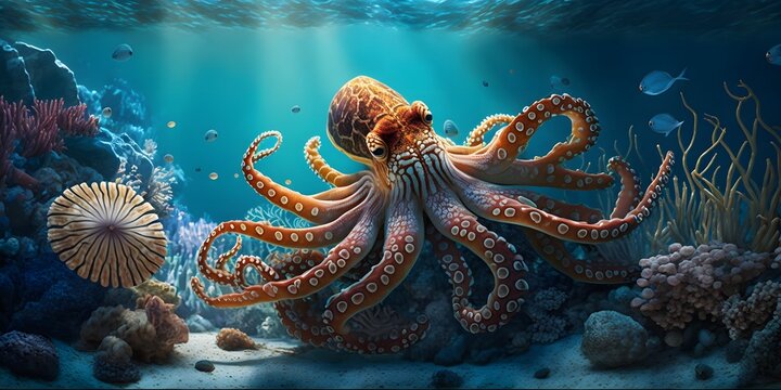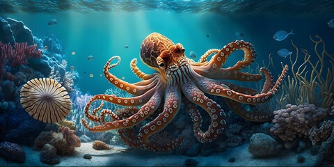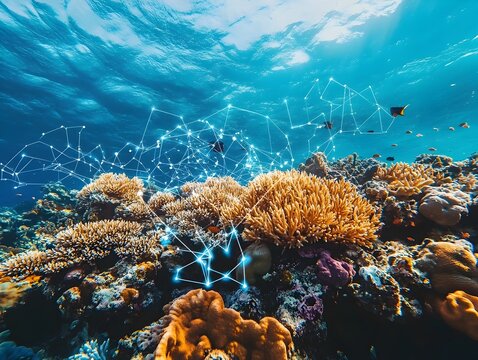Coral reef energy transfer with digital flow light concept for ocean biodiversity conservation innovation and underwater marine technology with futuristic data network