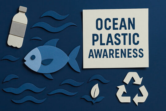 Ocean plastic awareness ocean fish wave bottle recycle sign blue paper cutout environmental conservation pollution marine life activism