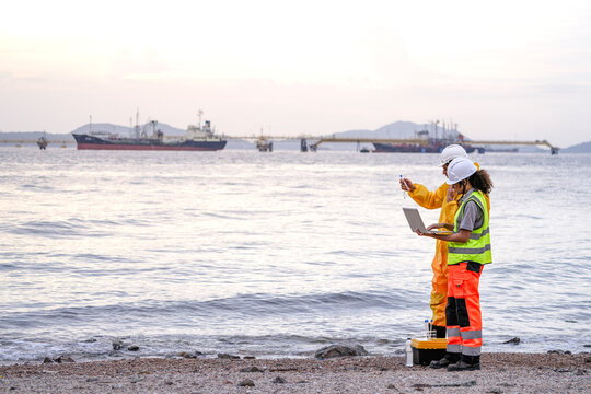 Two field scientists in PPE gear analyzing seawater samples using test tubes and a laptop. Environmental monitoring and pollution control on the coastline are depicted.
