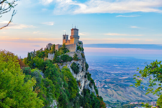 San Marino, medieval tower on a rocky cliff and panoramic view of Romagna
