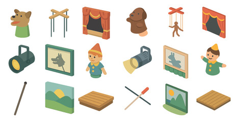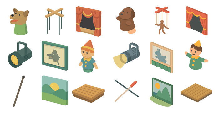 Puppet theater isometric icons set – flat, filled, marionette and stage design