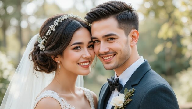 Eternal Bond: A radiant couple, embraces in an enchanting portrait, showcasing a union filled with love and hope, against a scenic outdoor backdrop.