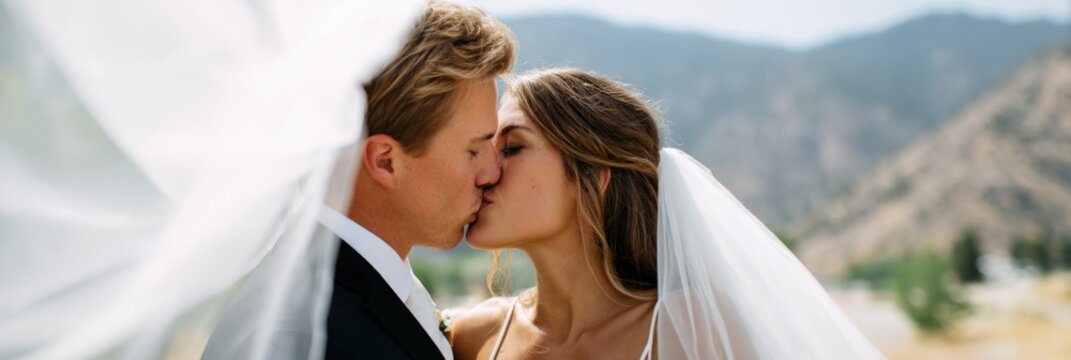 Young caucasian couple kissing at outdoor wedding with mountain backdrop