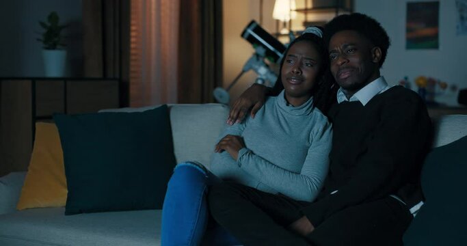 Young man of African origin asked attractive girl on date. Couple in love is sitting on sofa in the living room and watching movie. The guy gently hugged the girl. They discuss the movie and smile.