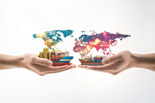 Global trade and shipping represented by hands holding cargo ships and world map elements in a conceptual design