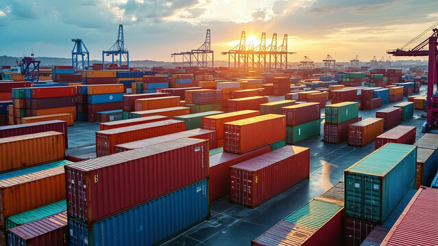 Aerial view of a bustling port with colorful shipping containers and cranes, capturing the dynamic flow of global trade in a video style.