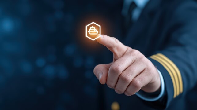 Captain in Uniform Using Touchscreen with Ship Icon for Navigation Concept in Maritime Technology