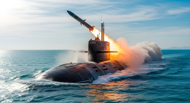 Ohio Class SSBN Vertical Missile Launch Over Blue Ocean with Sunrise and Fiery Plume