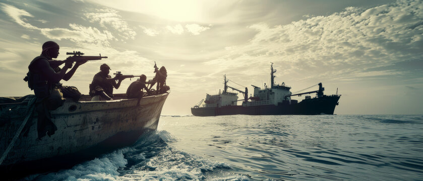 Armed guards on a skiff patrol the ocean near a large cargo ship under cloud-draped skies.