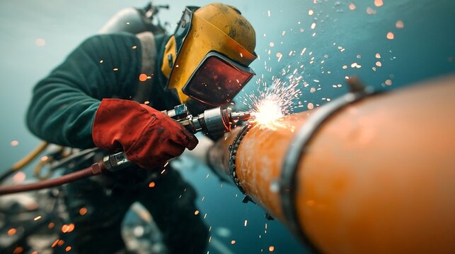 Muscular offshore welding technician using a specialized underwater welding torch to repair a section of corroded subsea pipeline in a murky deep sea environment