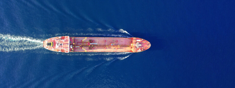 Aerial drone ultra wide photo of latest technology in safety standards crude oil tanker cruising Saronic Gulf deep blue sea, Greece