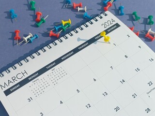 First march 2024 calendar marked with push pin concept of business events planning and reminder