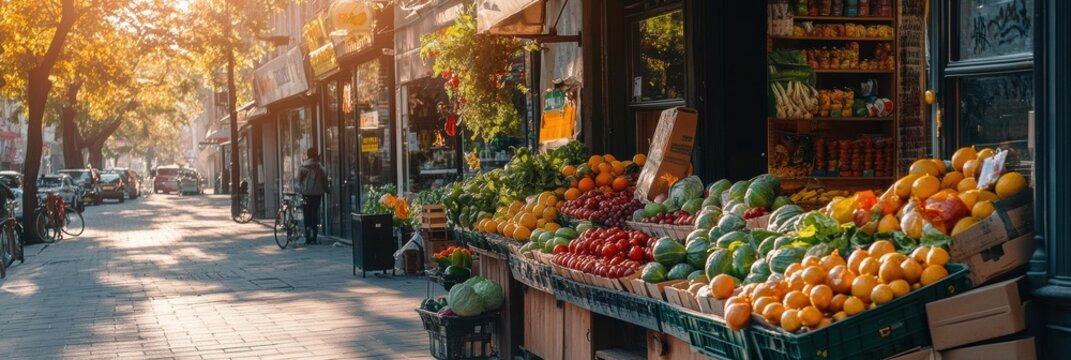 Colorful fruit and vegetable display at a corner grocery store on a lively city street during golden hour