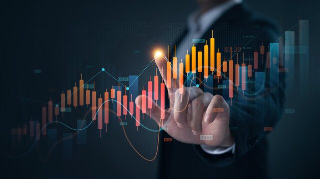 A person analyzes stock market data on a smartphone with colorful graphs displayed, set against a financial trading background