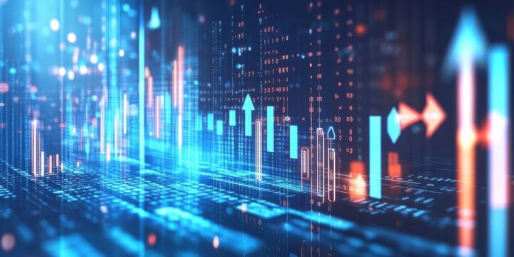 Digital Financial Market Data Analysis With Upward Arrow and City Skyline Photo