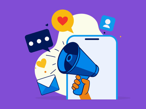 Vibrant megaphone with bold colorful speech bubbles floating in a clean modern space representing impactful marketing and social media messaging for brands campaigns and digital outreach