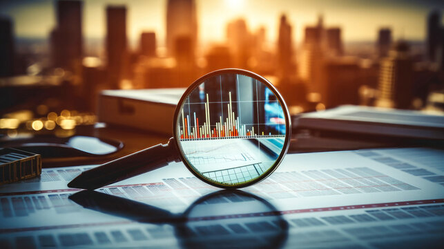 Magnifying Glass on Desk - Business Tool for Market Research and Analysis. Business Control over quotes and shares. Market research. Trader.