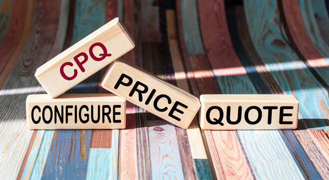 On a vintage background, light wooden blocks and cubes with the text CPQ Configure Price Quote