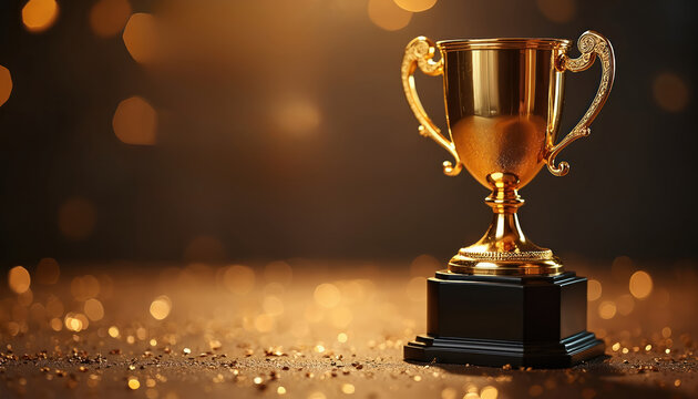 Golden trophy cup stands on table. Concept of winner champion success. Award with bokeh, gold glitter on dark background. Business, achievement, leadership, victory, sport competition concept.