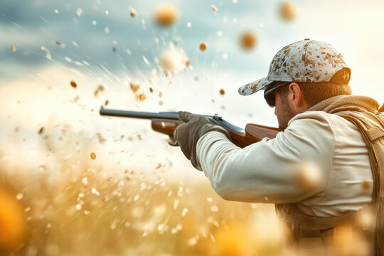 dynamic action shot of man aiming rifle in field, intensity of hunting. scene captures excitement and focus of moment, with debris flying around