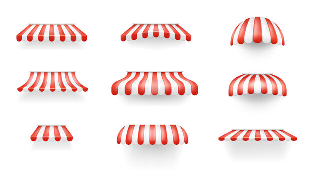 Shop sheds. Store canopy marquise tent for window cafe, scalloped canvas roof outdoor shelter house or beautiful awning of storefront market, realistic decent vector illustration
