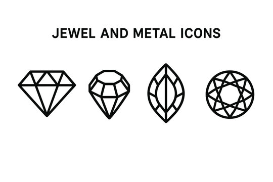 Jewelry outline icons set. Precious gemstone symbols for luxury design. Diamond, brilliant, round, and marquise cut gems. Elegant fashion vector logo elements for branding.
