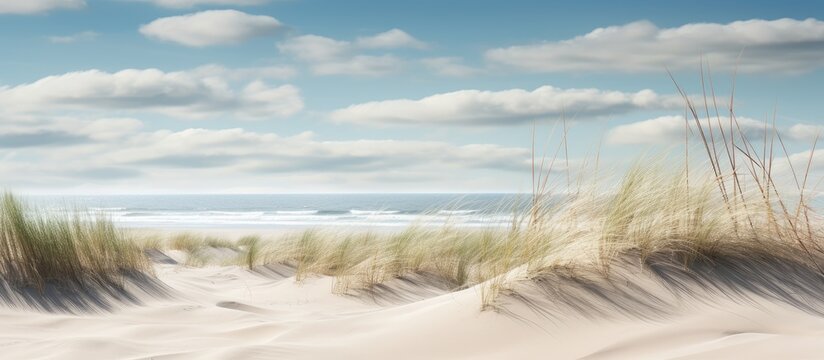 Sand dune landscape featuring marram grass, wind patterns, and a clear blue sky creating a tranquil coastal scene