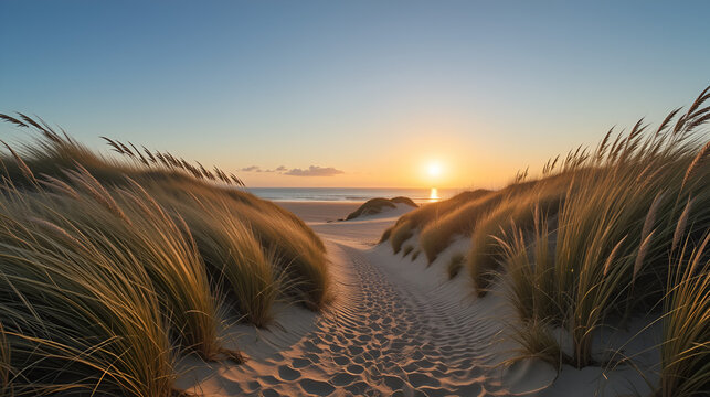 Sandy path through the dunes near Petten leading to the setting sun over the North Sea. This sandy trail, flanked by swaying marram grass in the gentle wind, leads  the North Sea beach.
