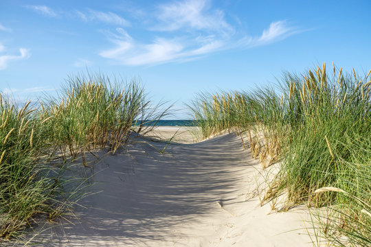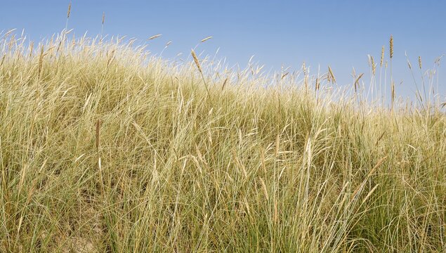 The dunes or dyke at Dutch north sea coast, European marram grass (beach grass) on the sand dune with blue sky as backdrop, Nature pattern texture background, North Holland, Netherlands.