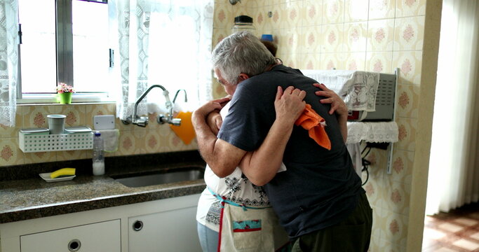 Husband celebrating success with wife. Older married couple hugging and kissing