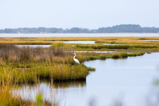 A Great Egret in salt marsh wetlands at Assateague Island National Seashore, Maryland