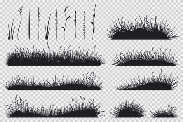Grass black silhouette. Vector set of meadow plants isolated on transparent background.