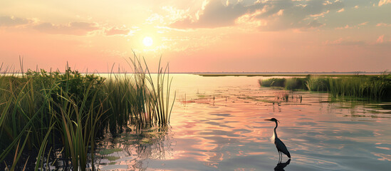 Sunset over the tranquil marshland wetland