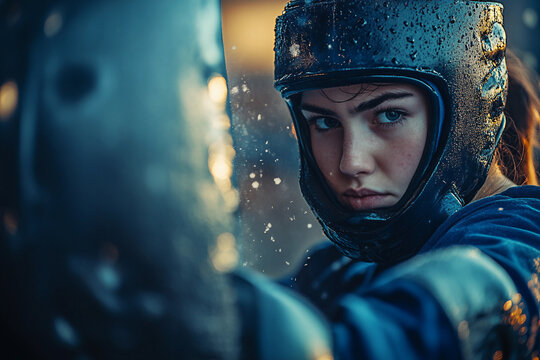 Young determined woman wearing boxing gloves working with trainer during self-defense course, practicing foot strikes on kick shield